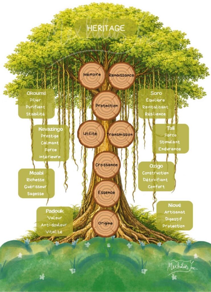 Cependant, notre démarche ne se limite pas à une seule essence. D’autres arbres sont représentés tout autour de l’Okoumé afin de rappeler que la richesse de la forêt gabonaise repose avant tout sur sa diversité. Il ne s’agit donc pas d’un arbre isolé, mais d’un écosystème vivant où chaque essence joue un rôle essentiel.